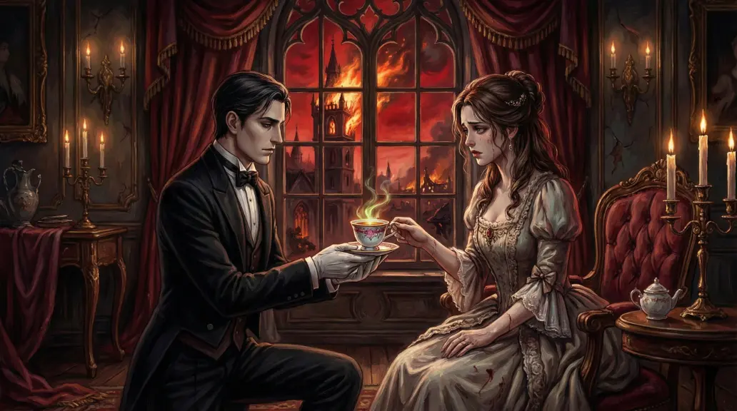 (ト書き:遠くで微かに響く地響きや破壊音。しかし、部屋の中は異様なほど静か。カチャリ……と、ティーカップとソーサーが触れ合う上品な音が響く)