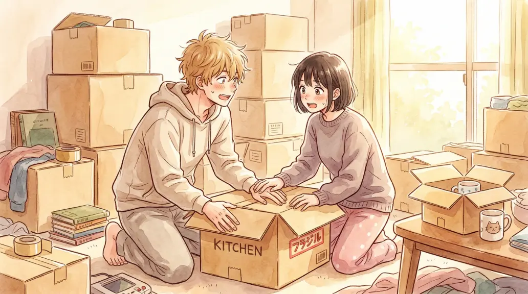 特別な事件は起こりませんが、引っ越し直後のごちゃごちゃした部屋で繰り広げられる、リアルで「てぇてぇ」日常のワンシーンです。